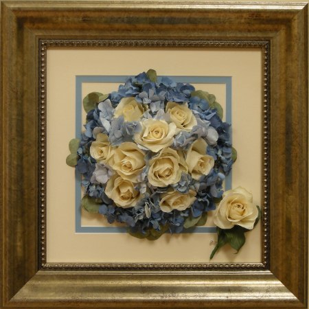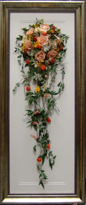 This beautiful bouquet of apricot and cream roses, freesias , hypericom berries and poppy heads looked amazing in our pewter frame Before