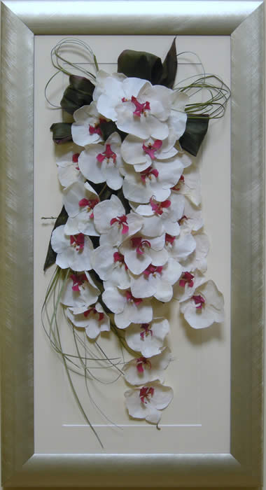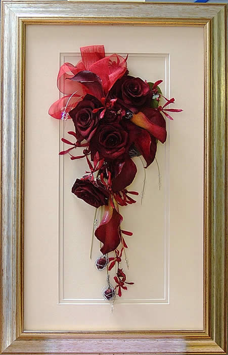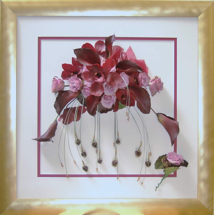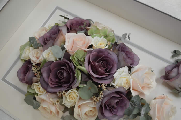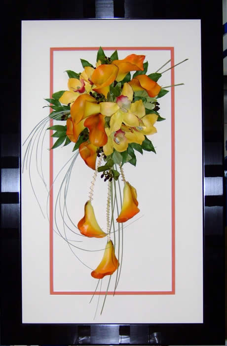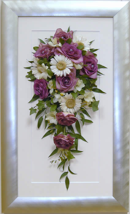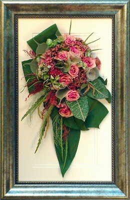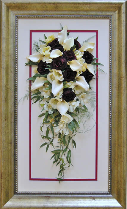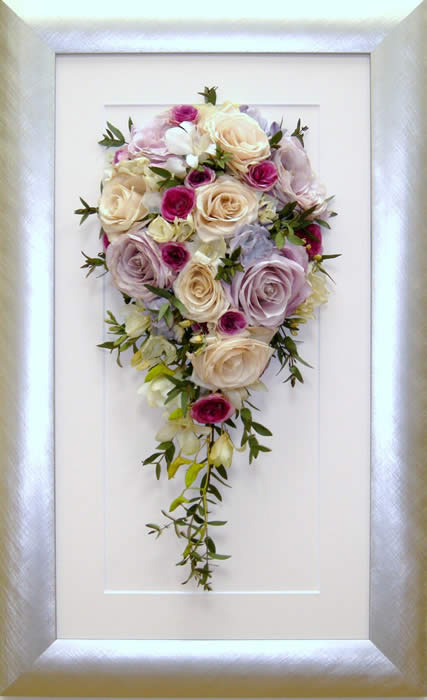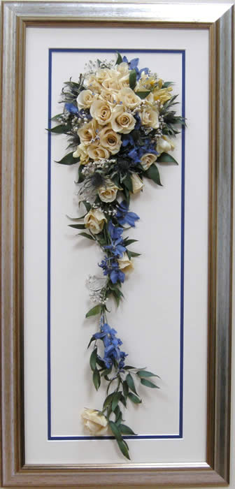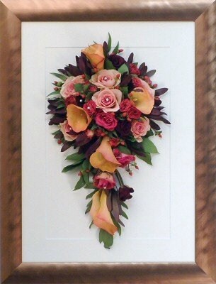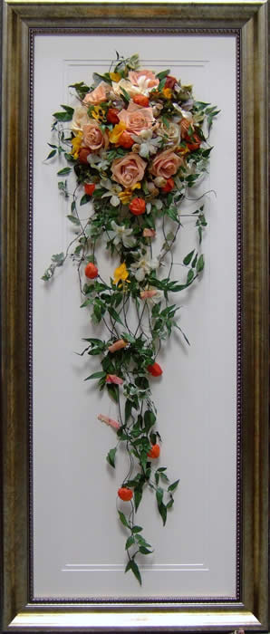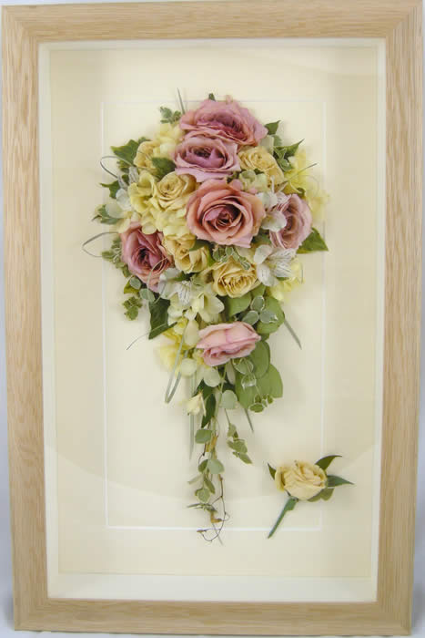 Please see below some examples of trailing bouquets that we have preserved at Precious Petals.All our frames are hand made to fit our customers flowers by our expert framer and glazed with conservation glass. We do not charge extra to include buttonholes, photographs or invitations in the display.