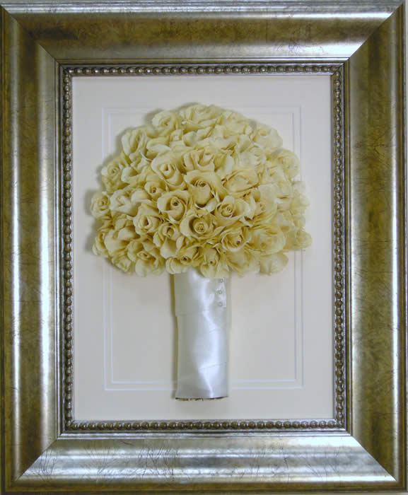 Mrs Humes beautiful bouquet of cream roses. She chose our pewter frame to display her flowers in with a double cream mount.